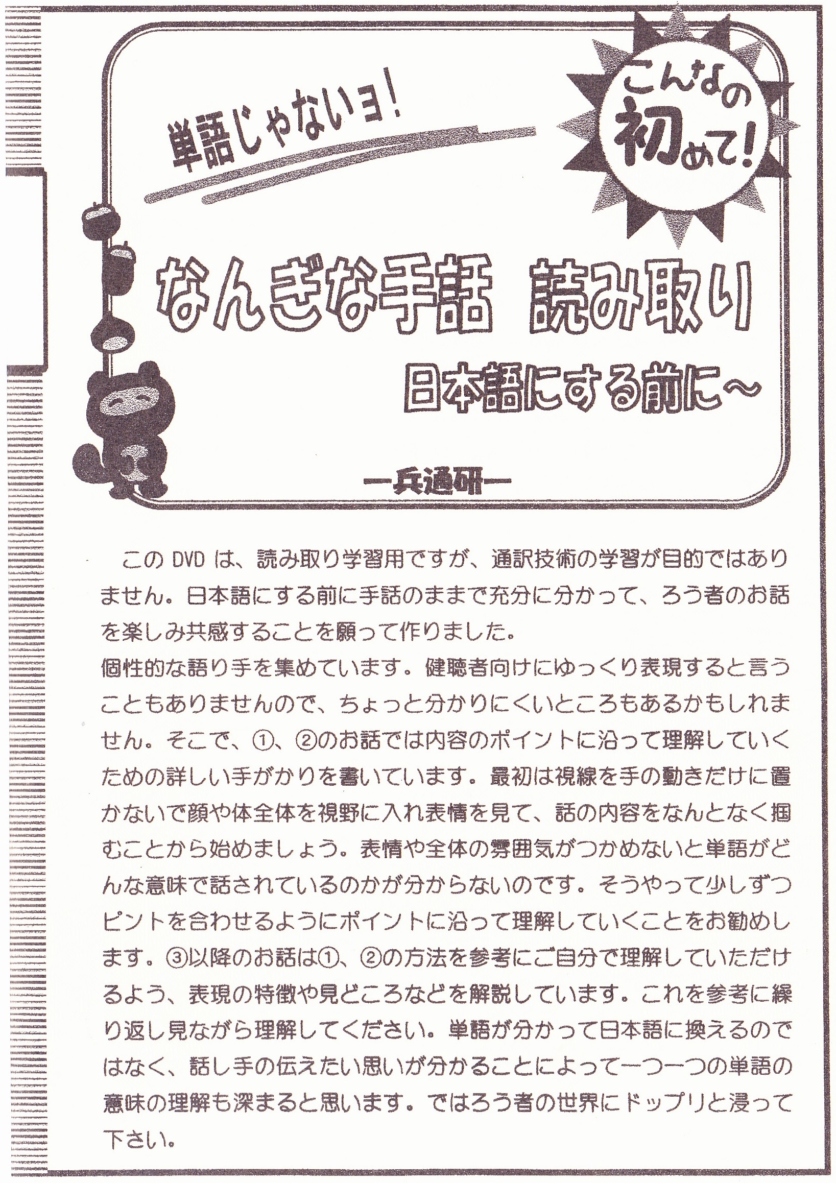 「日本語を聞いて手話に変える方法」を考える手掛かりになるDVDです。 |
